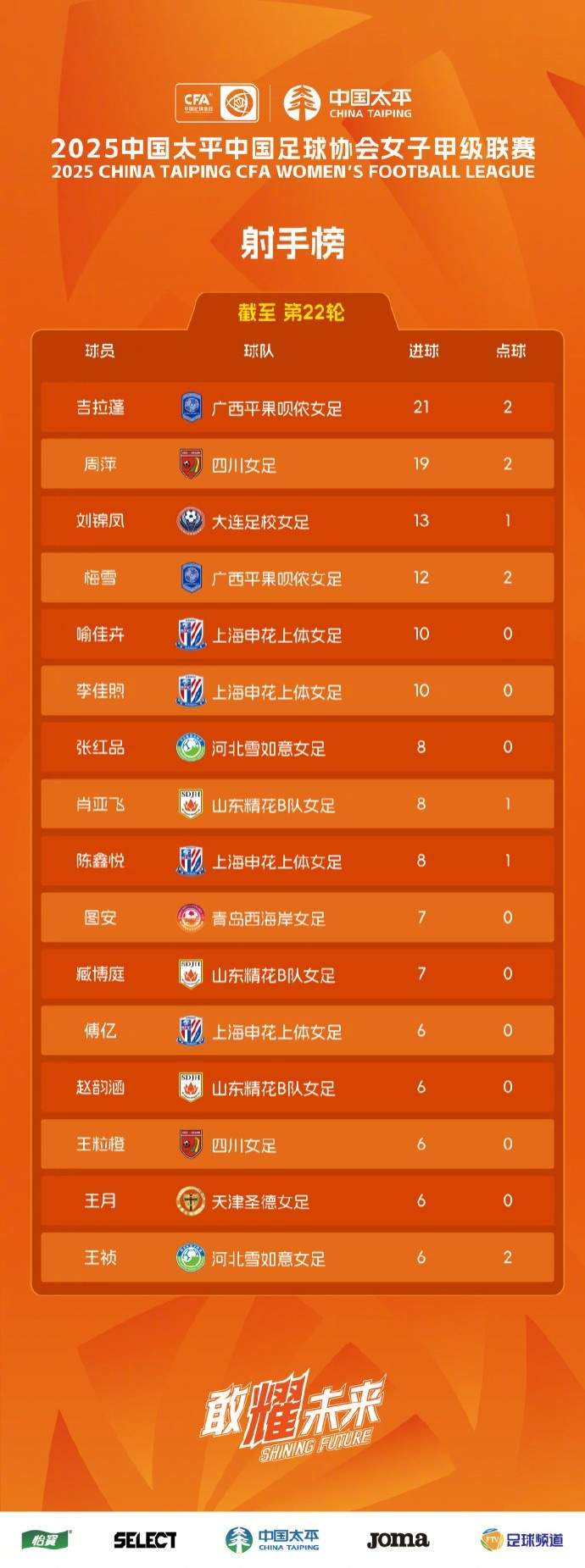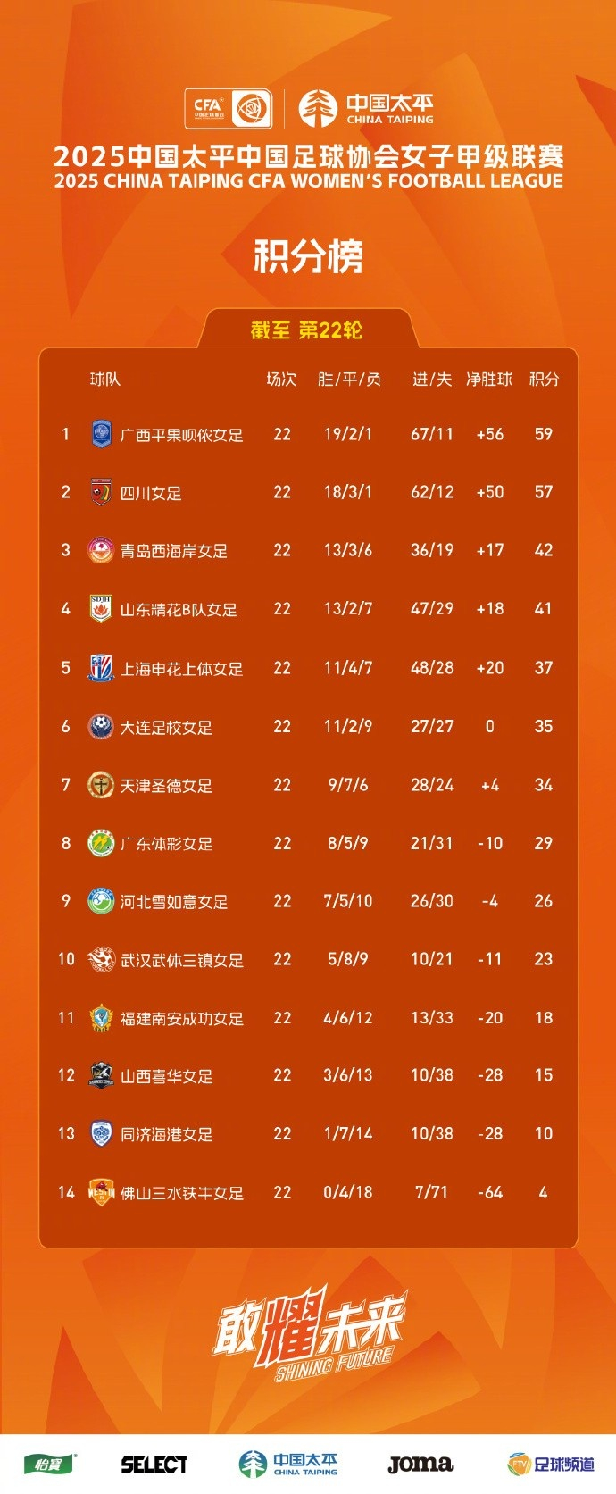 申花上体女足总战绩22轮11胜4平7负,积37分暂列女甲联赛第五